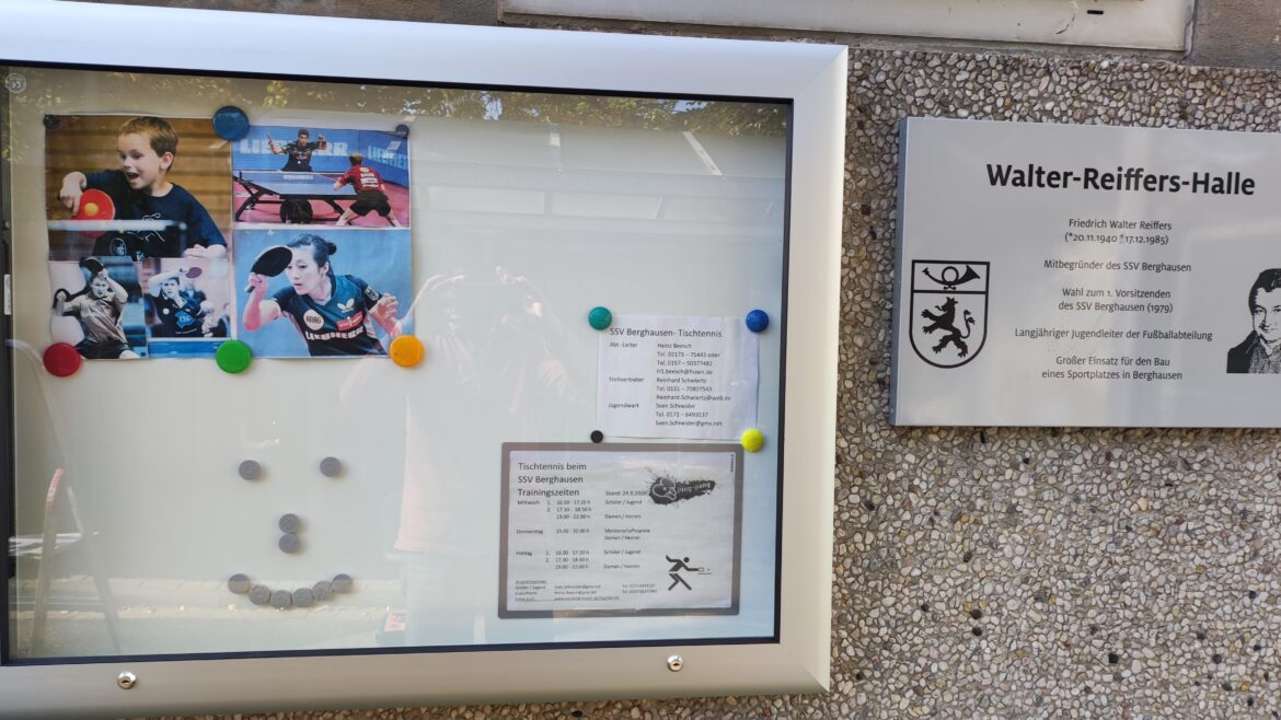 Aus der REWE-Aktion „Scheine für Vereine“ konnte ein neuer Schaukasten angeschafft werden. Dieser wurde heute an die Aussenwand der Walter-Reiffers-Halle angebracht und enthält Informationen zu Trainingszeiten des SSV Berghausen sowie den Ansprechpartnern der Abteilungen.