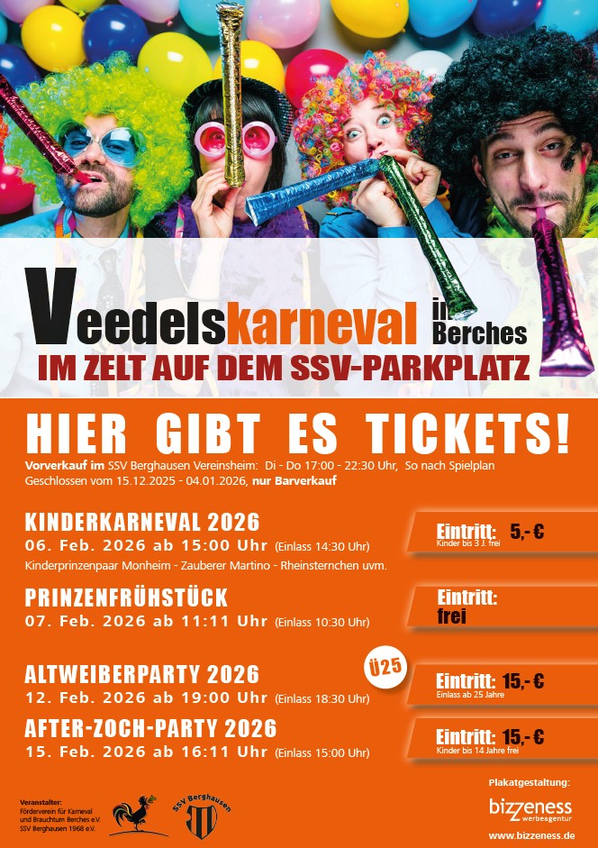 Heute gibt es noch einmal die Tickets für unsere beliebten Karnevalsveranstaltungen im Vereinsheim. Zwischen 18 und 22 Uhr ist das Vereinsheim geöffnet, bevor es in die Weihnachtsferien geht.